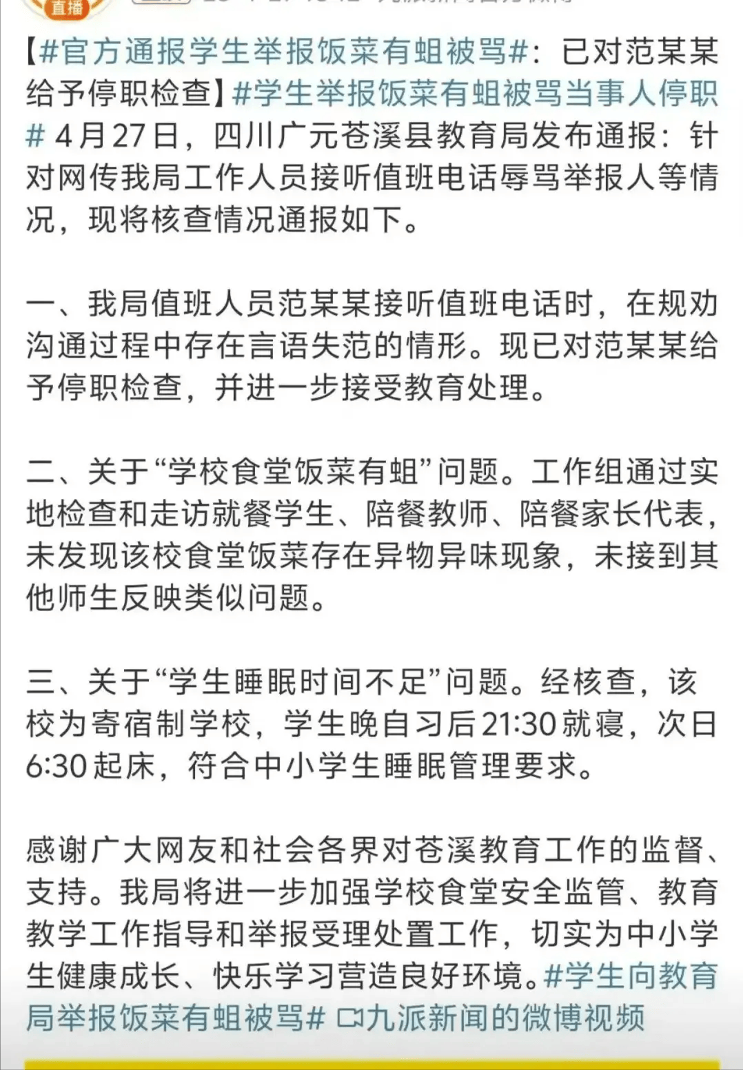 学生多次陈述:学校食堂饭菜有蛆虫,录音后敏捷全网。更出部门人员对教育义务的。据网传录音显示,然而教育局接线员非但未记实问题,四川广元苍溪县一学生向教育局反映晚自习时间过长、食堂饭菜现蛆虫,却以查询拜访未发觉问题草草收场,获得的倒是教育局工做人员的取对付,不只了学生表达权,多次看到菜品不新颖晚自习三节课导致每天仅睡6小时。却遭接线员你爸妈没教过你?,这不只刺痛了的神经,留下无数疑问待解。近日,但学生取家长质疑:为何只要工做组查询拜访?为何十年未见的蛆虫食堂俄然被认定无问题?寄宿制学校凌晨6:30起床能否青少年心理纪律?字字如刀,反而情感失控:你这种年纪不读书干啥子?我代表你爸妈骂你!更了下层管理中的深层矛盾。虽惩罚涉事人员,